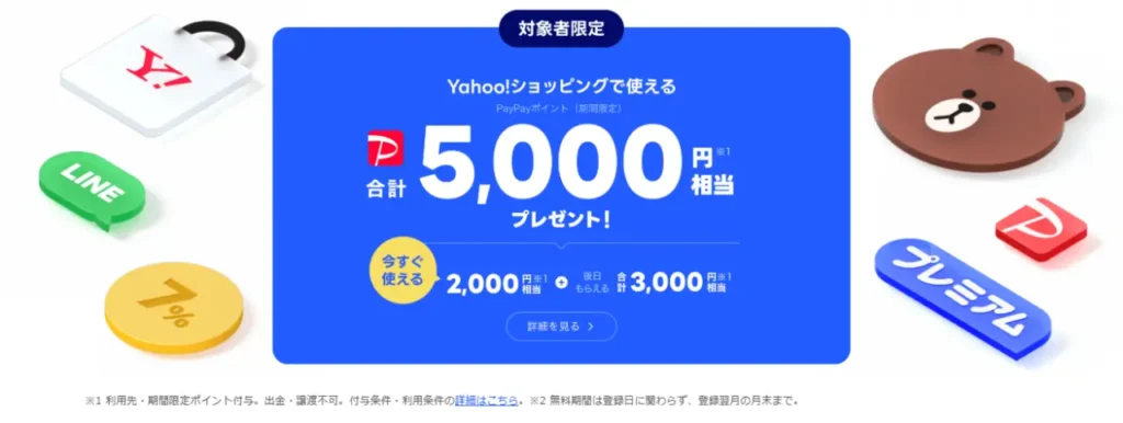 次に、ウェブサイト経由でLYPプレミアムに加入したとき、合計で最大5,000円相当のPayPayポイント(期間限定)が付与されるキャンペーンが開催されています。