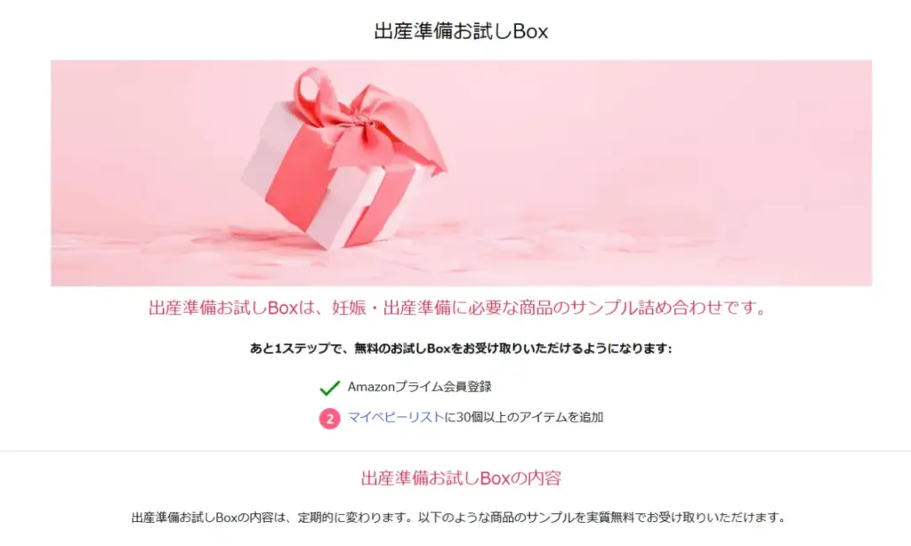出産準備お試しBoxはプライム会員限定で、かつマイベビーリストに30個以上商品を追加することも条件なので、出産予定日が決まったら早めにリストに商品を追加しておきましょう。