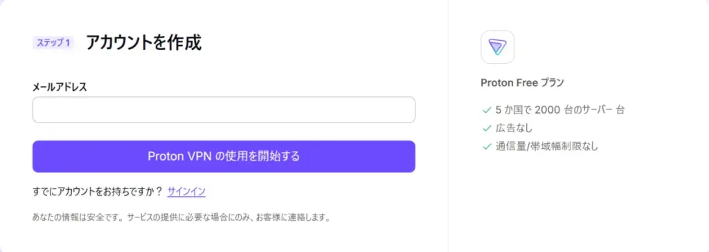 無料プランProtonVPNのアカウント作成方法