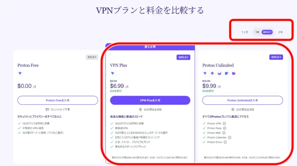 次に、プランを「VPN Plus」または「Proton Unlimited」から選択します。