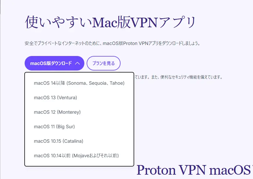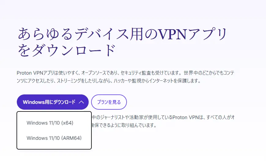 OS別にProtonVPNアプリのバージョンが異なるので、自身のOSと同じものを選択してください。