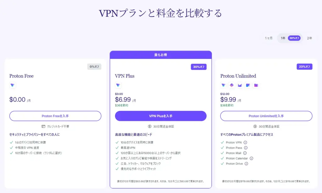 ProtonVPNには無料版の「Proton Free」、VPNに特化した「Proton Plus」、フルスペックの「Proton Unlimited」という3つのプランがあります。