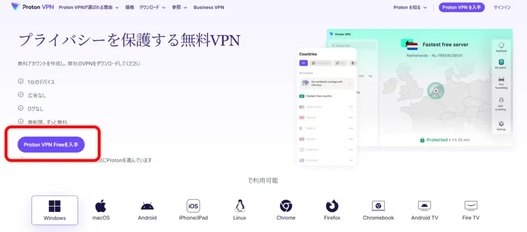 無料プランでも日本に設置されたサーバーが利用できます。 - キルスイッチが利用可