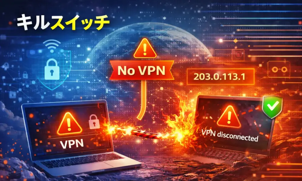 VPN接続が途切れた瞬間に通信を強制遮断して、あなたの本当のIPアドレスなどが“漏れる”のを防ぐキルスイッチ。