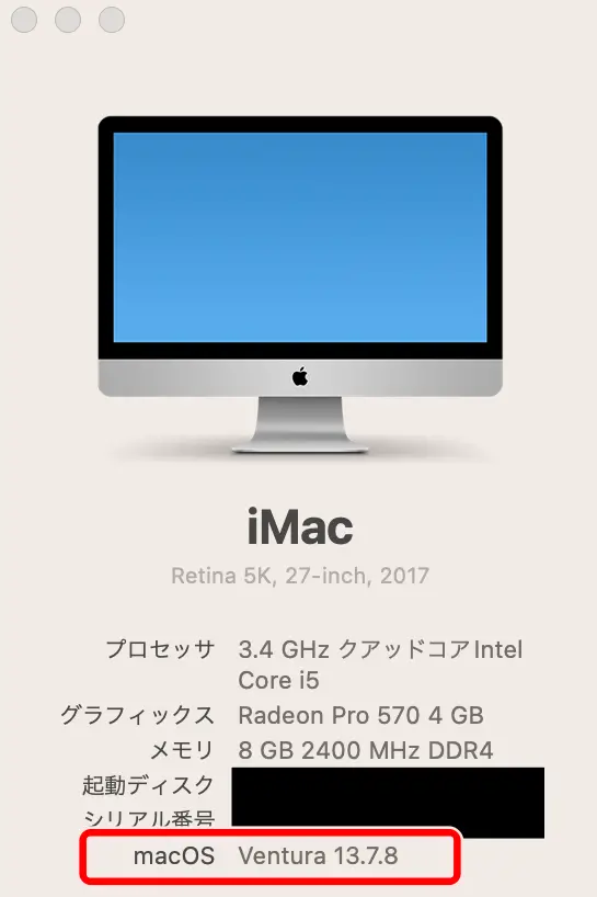 左上のリンゴマーク → このMacについて を確認します。