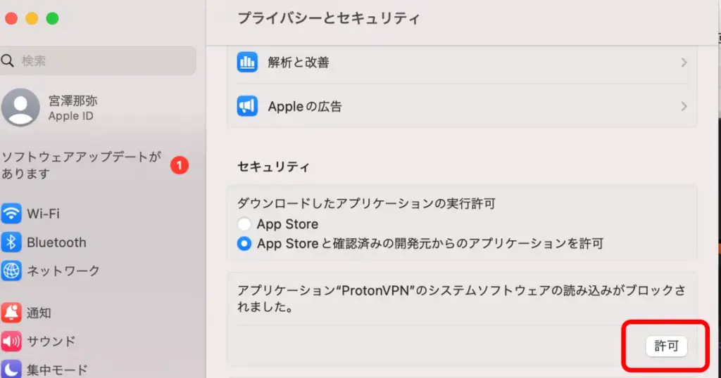 セキュリティ欄に、「アプリケーション”ProtonVPN”のシステムソフトウェアの読み込みがブロックされました。」と表示されているので、「許可」をクリック。