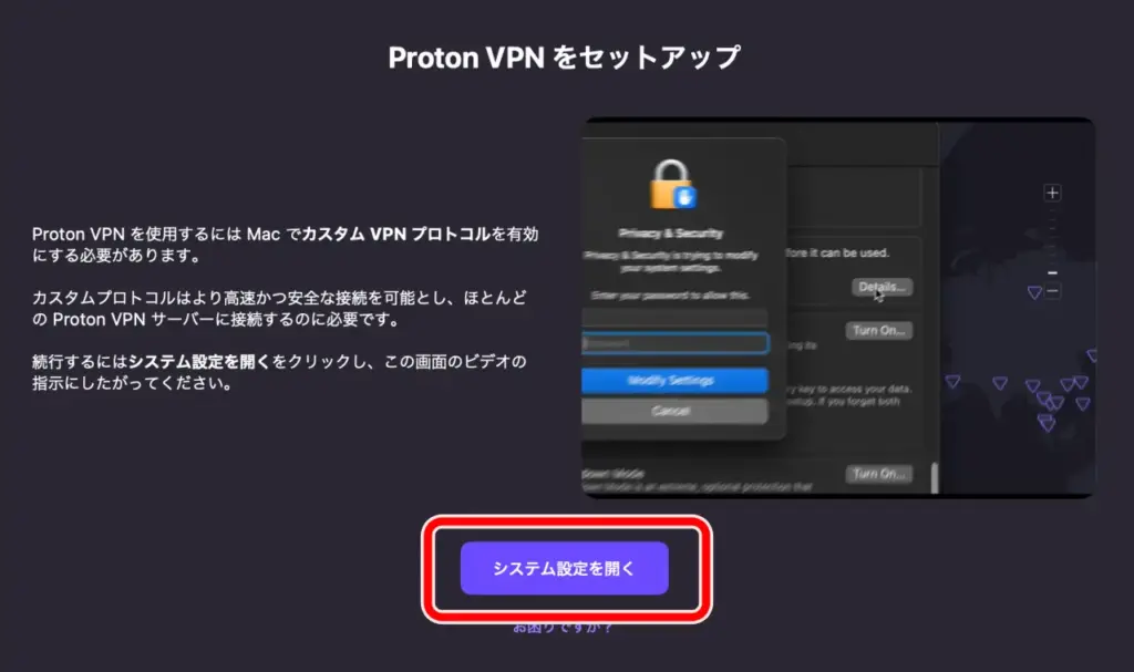 macOSでProtonVPNを使うため、カスタム VPN プロトコルを有効にします。