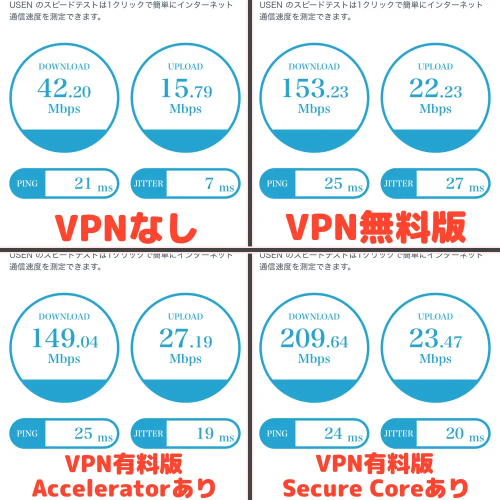 平日20:00に測定した「VPNなし」、「VPN無料プラン」、「VPN有料プラン」の通信スピードです。(スマホ5G回線)